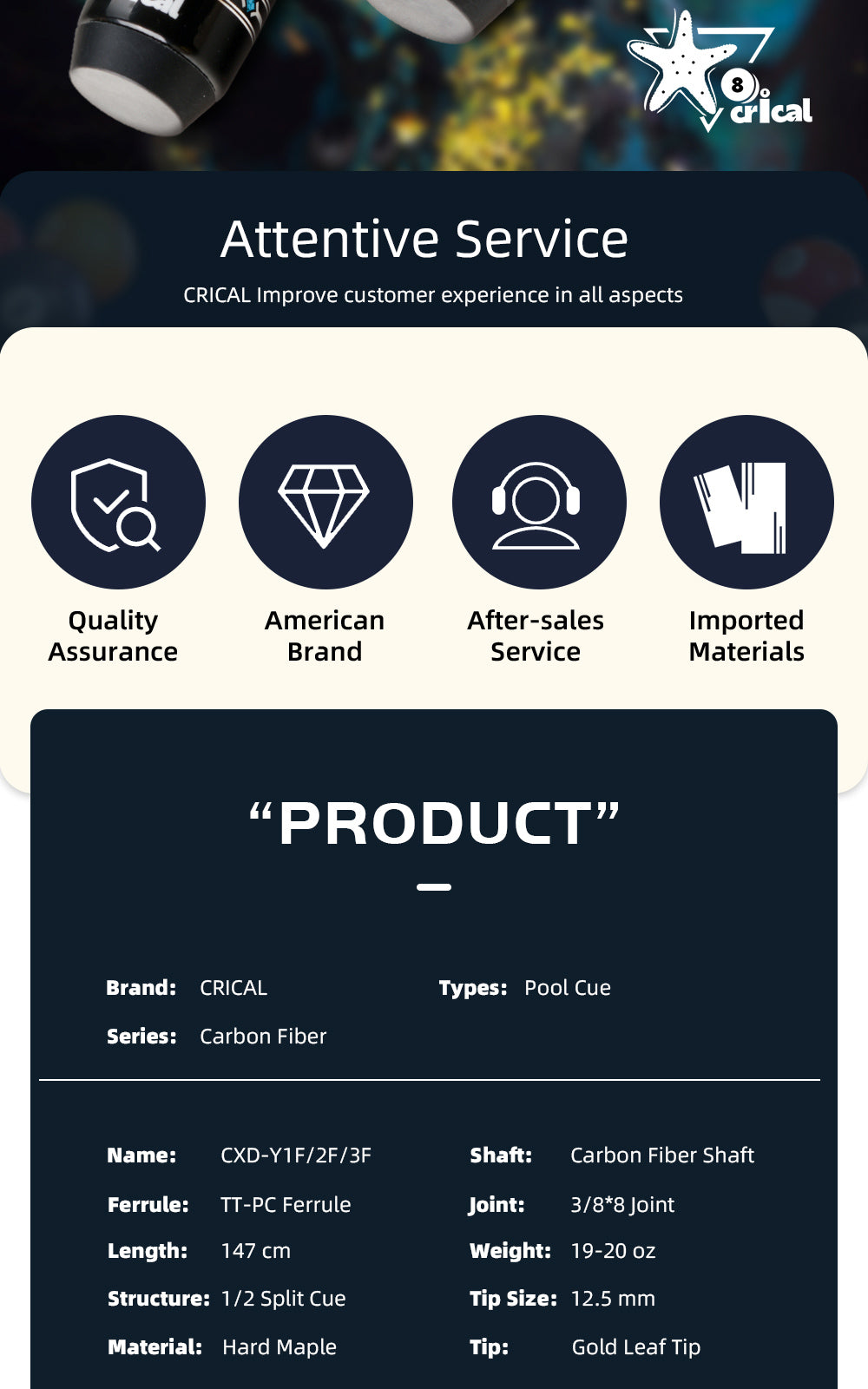【CRICAL】CXD-1BF Carbon Fiber Pool Cue Stick with 12.5mm Tip Low Deflection shaft for Billiard Cue Sticks
