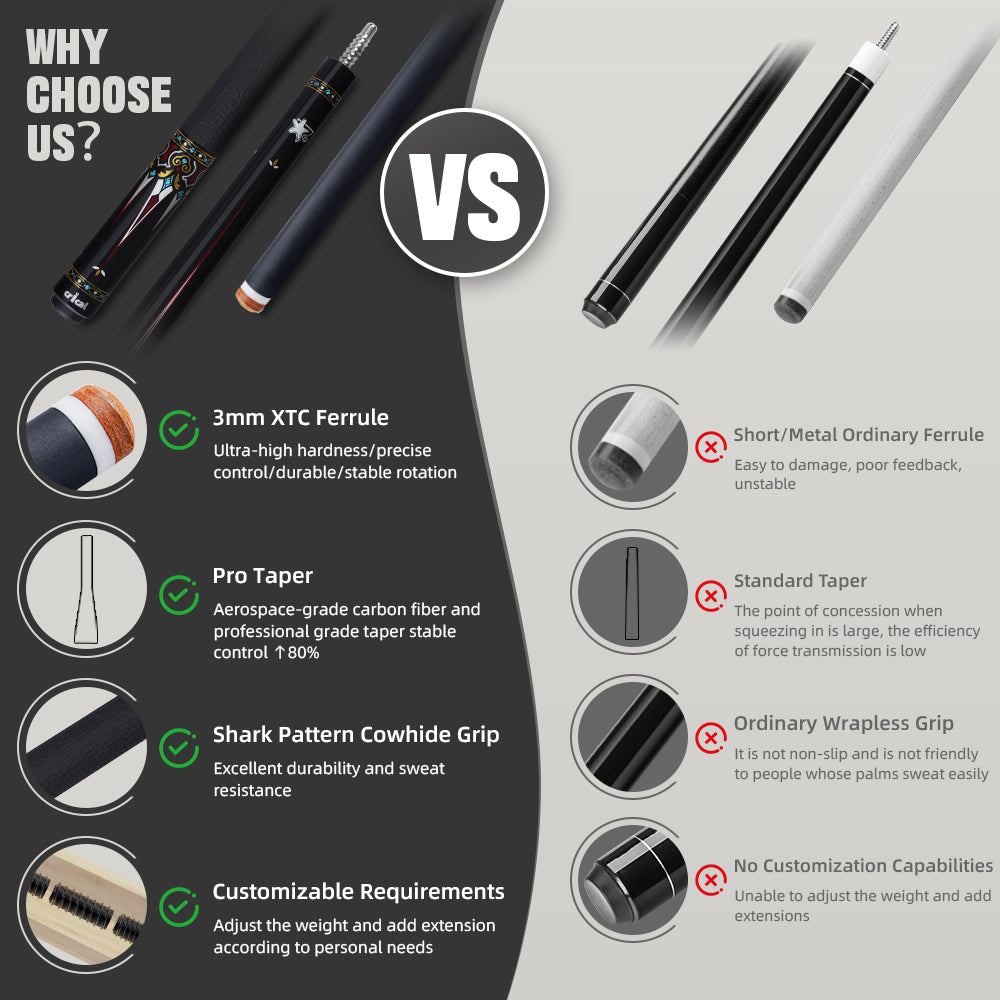 - Carbon Fiber Cue Shaft: This carbon fiber pool cue shaft is filled with customized foam inside, which allows for less deflection on shots with a lot of spins, and it performs consistently and accurately. It is suitable for most professional players, giving players an edge on the table, and making you perform better than you can imagine.
