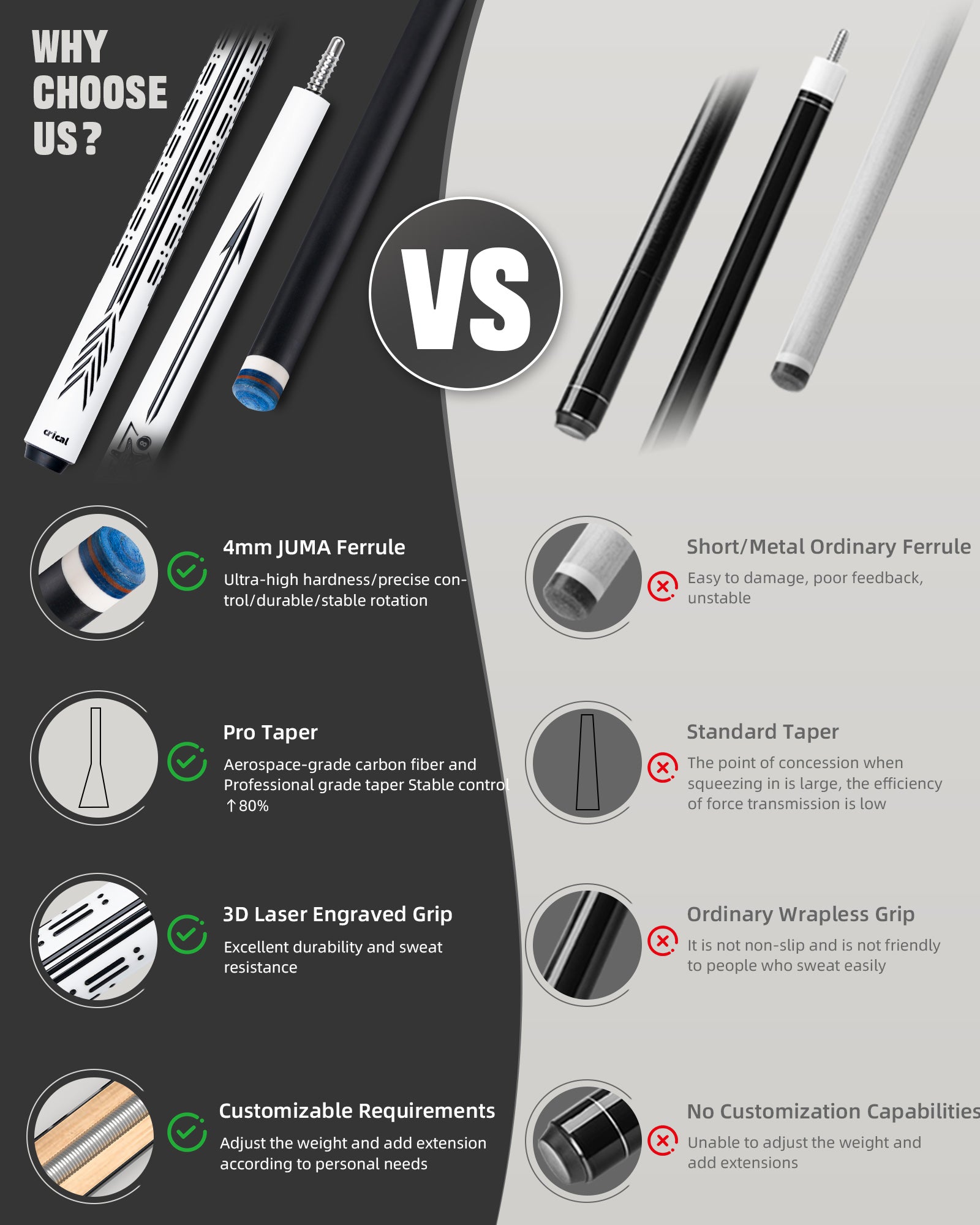 - Advanced Laser-Engraved Grip: The CRICAL pool cue features a unique 3D laser-engraved texture, delivering a secure, non-slip hold. This wrapless billiard cue is easy to clean with a simple wipe and requires no periodic replacement like traditional wraps, ensuring durable performance and ultimate convenience
